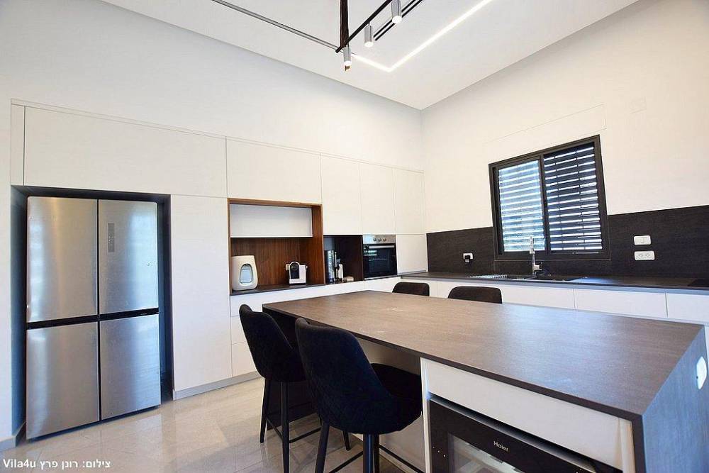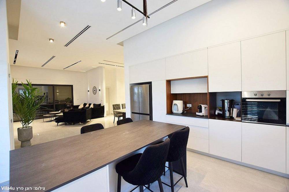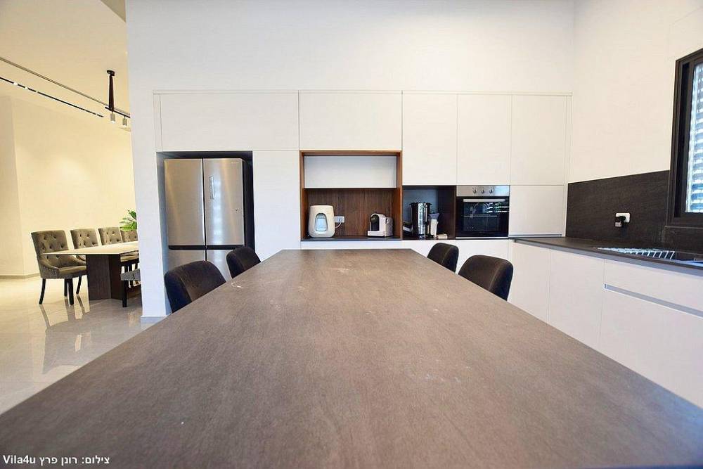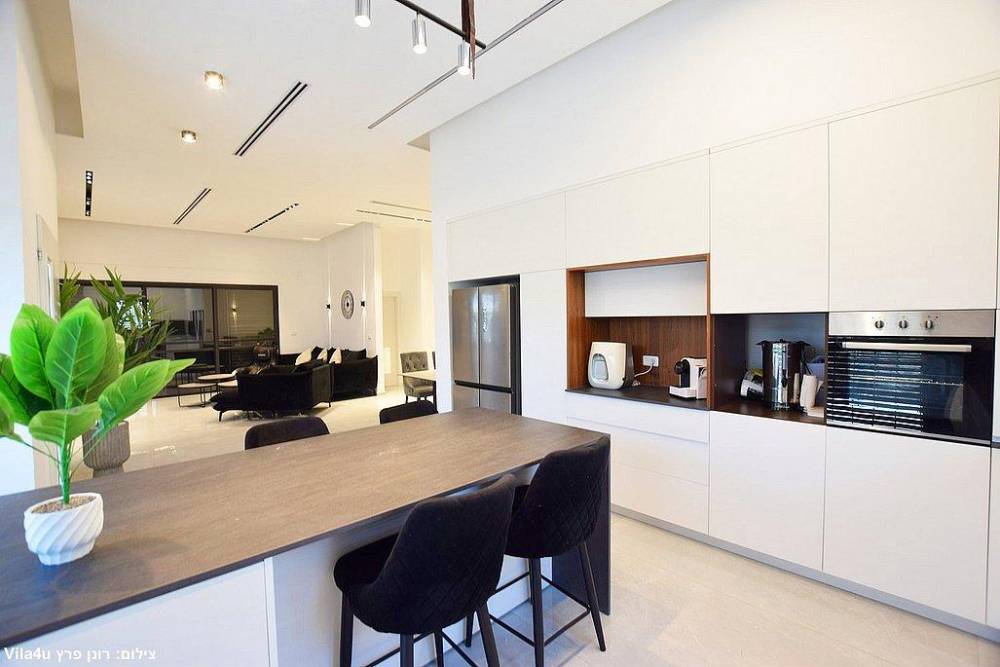 מטבח מאובזר (חברת סמל) הכולל מקרר, מדיח כלים, מיקרוגל, כיריים אינדוקציה, שיש יוקרתי (חברת דקטון), בר מים, מכונת קפה וכלי אוכל והגשה