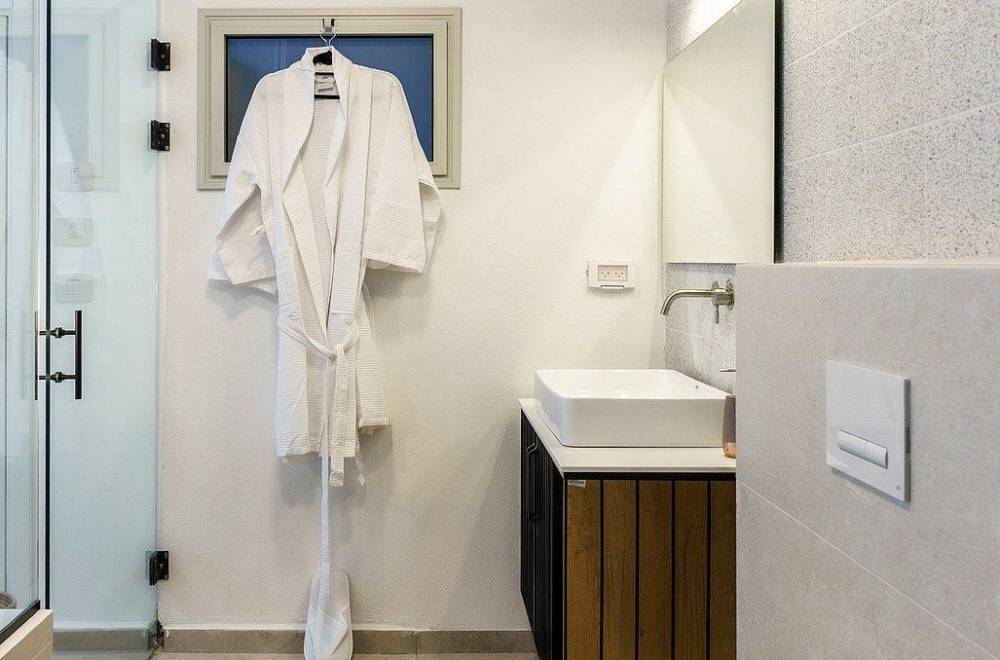 • חדר רחצה עם מגבות, תכשירי רחצה וקרם גוף