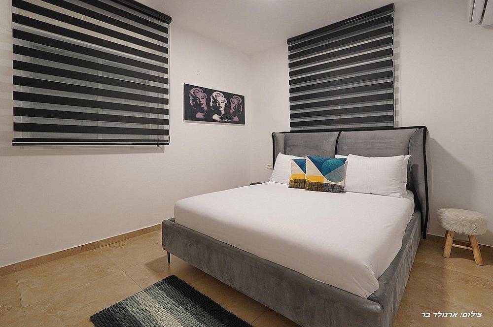 אבזור החדרים: מיטה זוגית מוצעת, מיזוג אוויר, שידות,