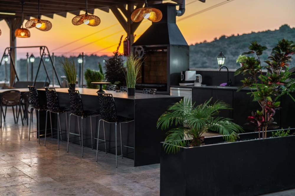 פינת מנגל מקורה עם מטבח חיצוני מאובזר הכוללת טאבון, כיור, משטח עבודה, מנגל מקצועי, 2 פינות אוכל ומערכת ישיבה.