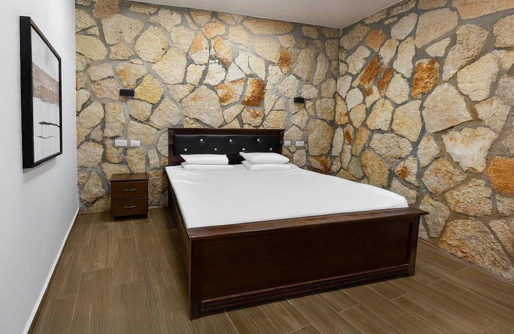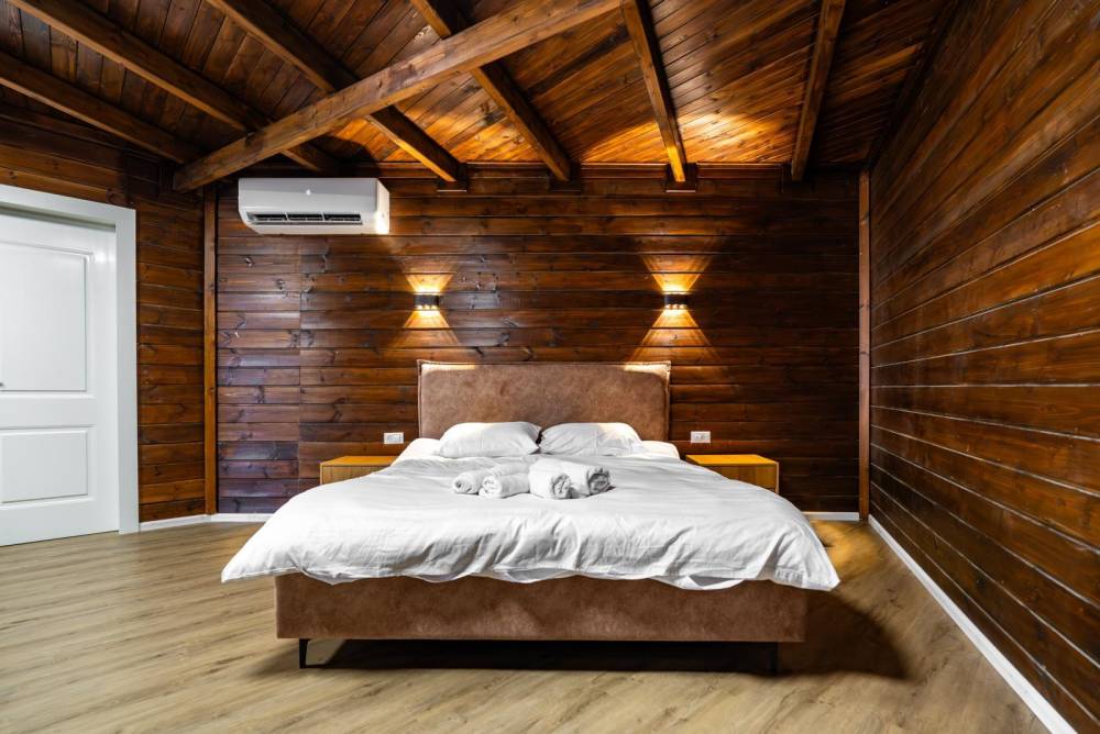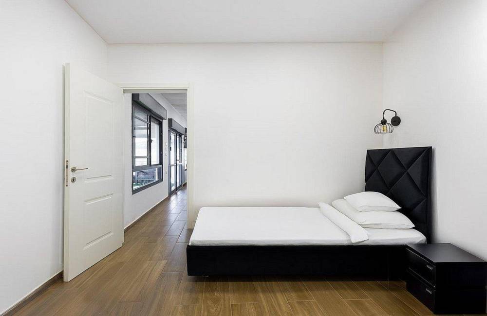 5 חדרי שינה המכילים: מיטה זוגית, מיזוג אוויר, טלוויזיה ושידות אחסון.