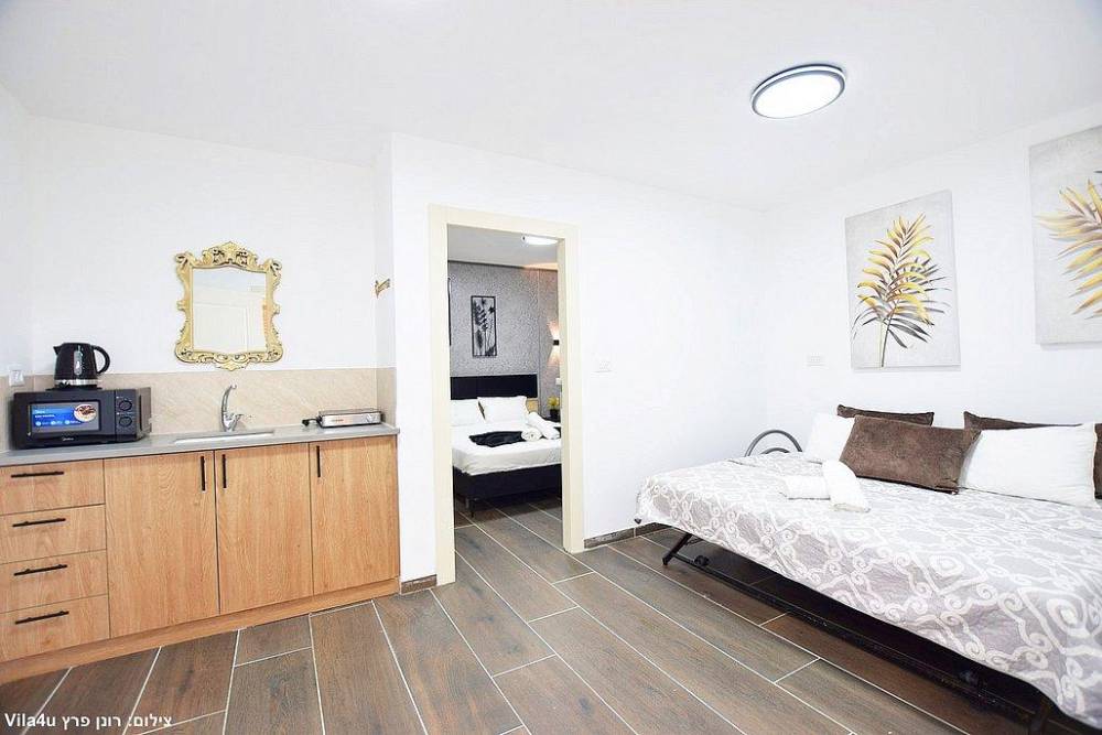 חדר שינה נוסף עם ספה נפתחת ומטבחון מאובזר עם פינת קפה ומקרר