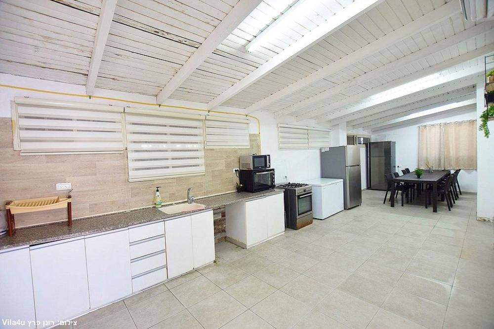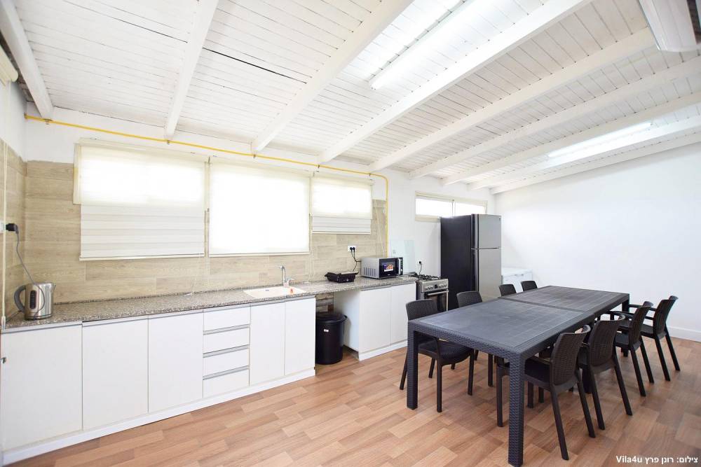 מטבחון מאובזר הכולל: קומקום, מיקרוגל, מקרר וכיריים חשמליות.