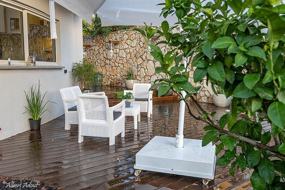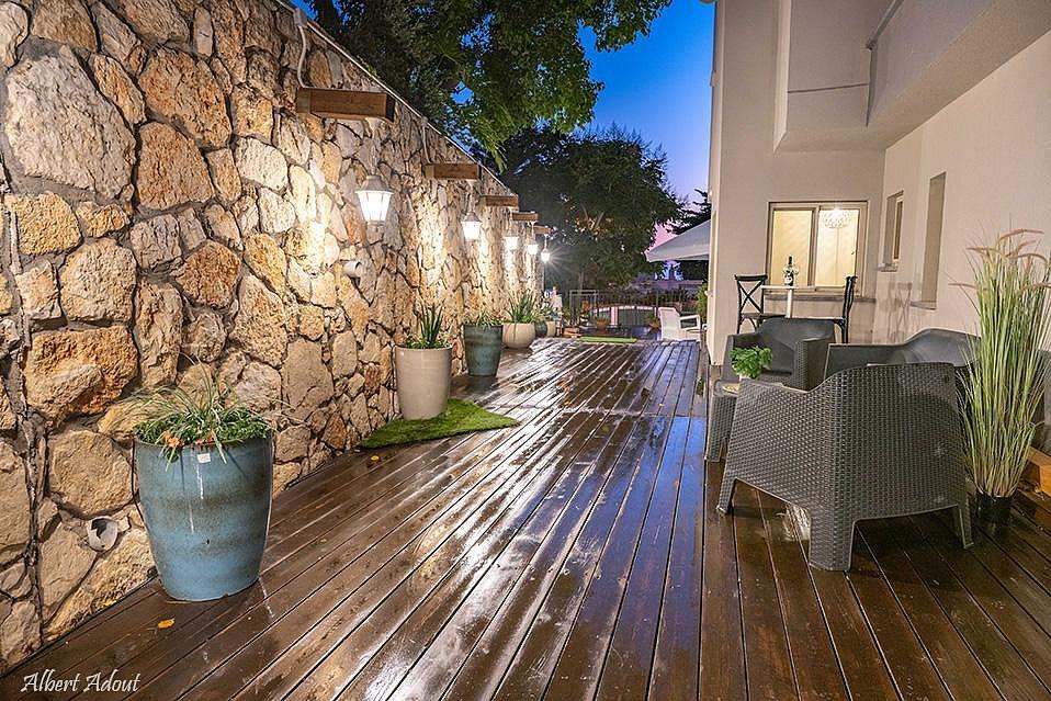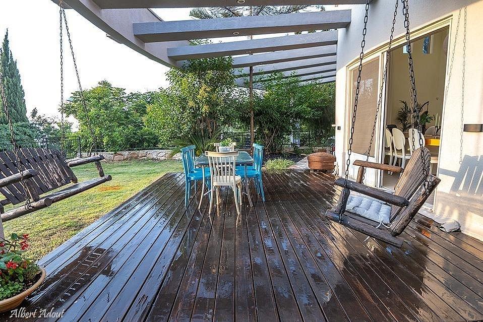 חצר גדולה עם מתחם דק ובריכת שחייה