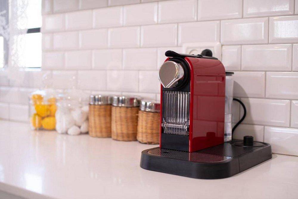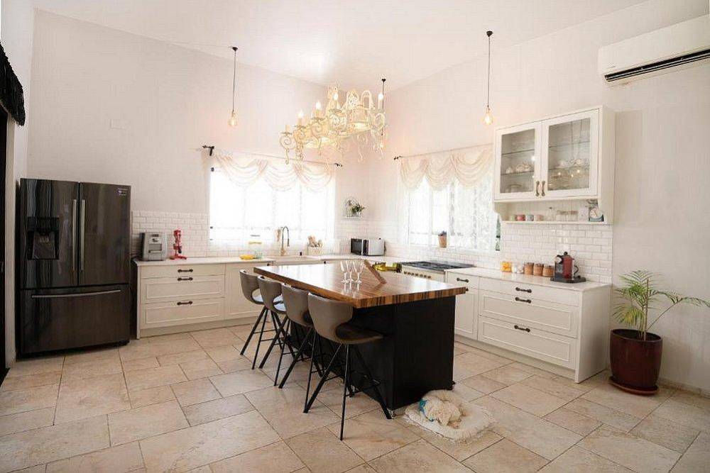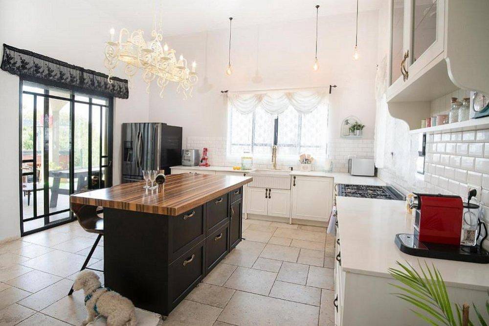 מטבח מאובזר: מקרר, מיקרוגל, תנור, מכונת קפה, כלי אוכל והגשה.