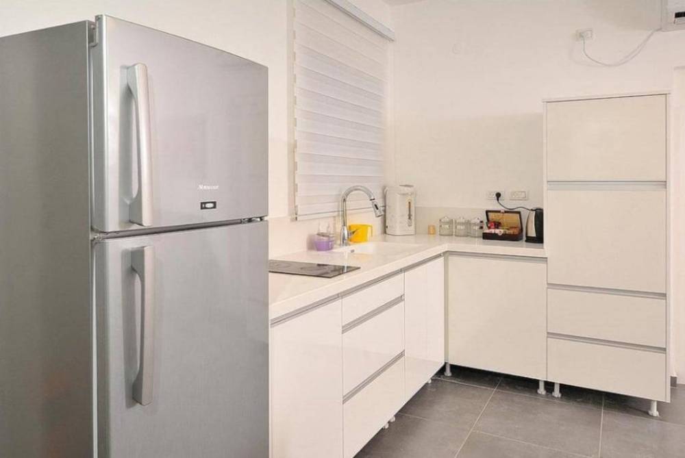 מקרר, כיריים חשמליות, תנור אפייה, מיקרוגל, פינת קפה עם קומקום חשמלי.