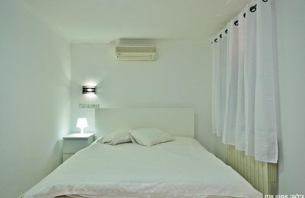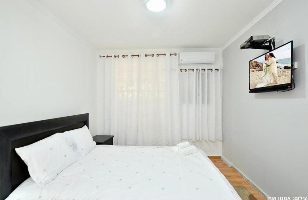 מיטה זוגית, מסך שטוח בגודל 48 אינץ', ארונות לאחסון ושידת לילה