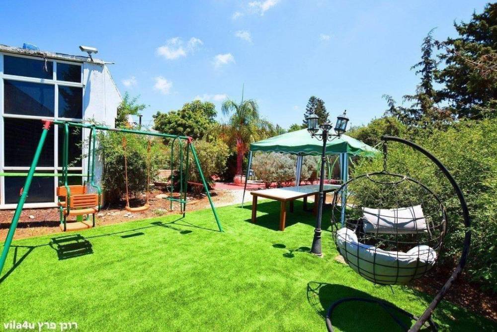 החצר של הוילה משלבת גינה גדולה ומטופחת לצד מתחם מקורה שמכיל ג'קוזי ספא