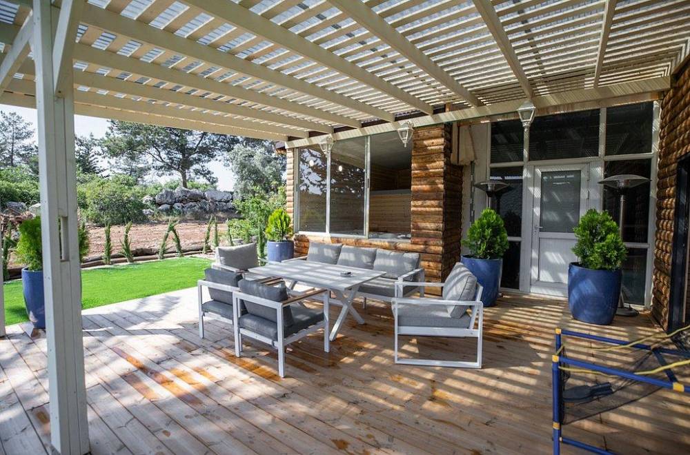 חצר גדולה עם מתחם דק ובריכת שחייה
