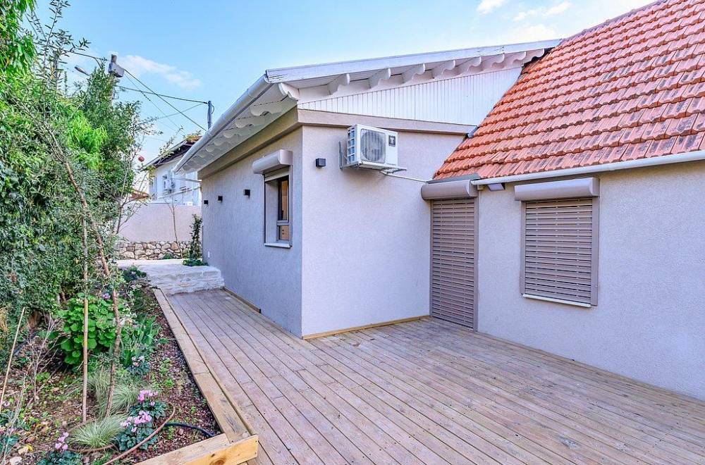 חצר גדולה עם מתחם דק ובריכת שחייה