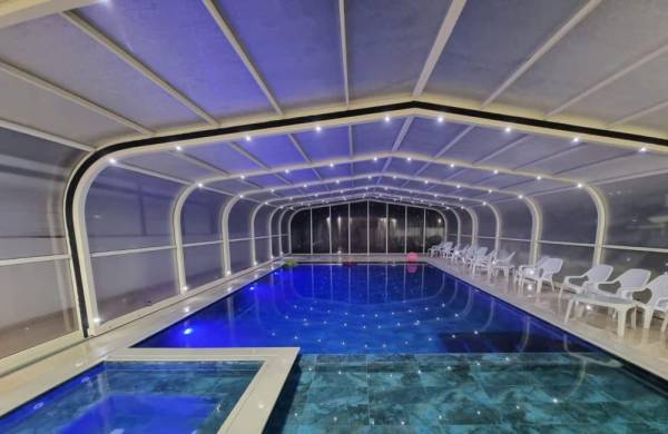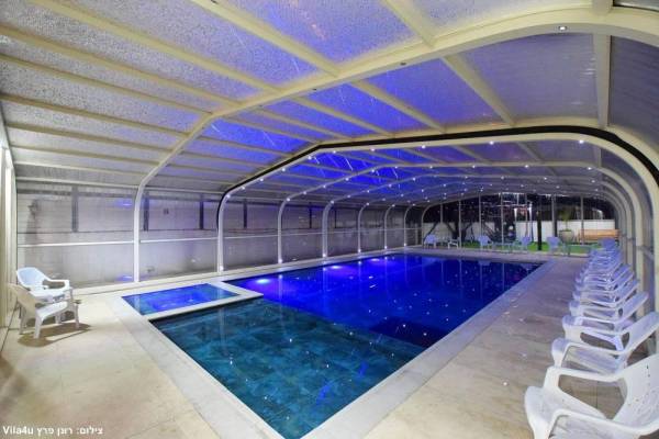 בריכת שחייה ענקית משולבת עם בריכה לילדים וג'קוזי (בגודל 15X6 מטר) הבריכה מחוממת ומקורה בחורף