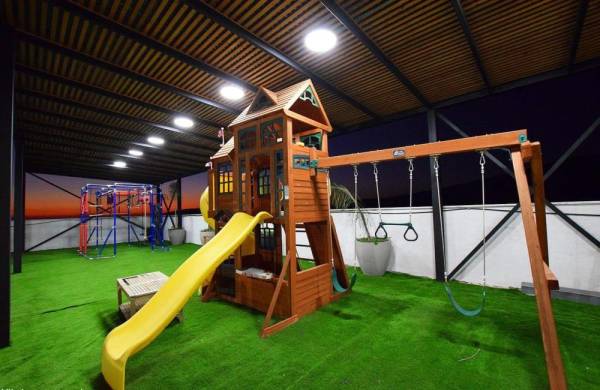 מתחם משחקים לילדים הכולל - בית משחקים, מגלשות, מתקן נינג'ה, נדנדות ועוד.