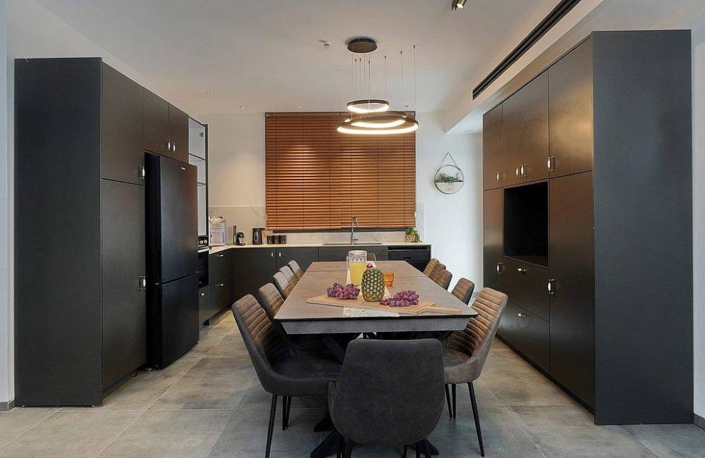 מטבח מאובזר עם 2 תנורים, 2 כיורים, כיריים גז, מיקרוגל, מקרר, תמי4, כלי אוכל והגשה