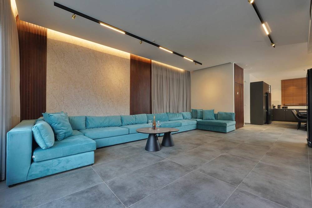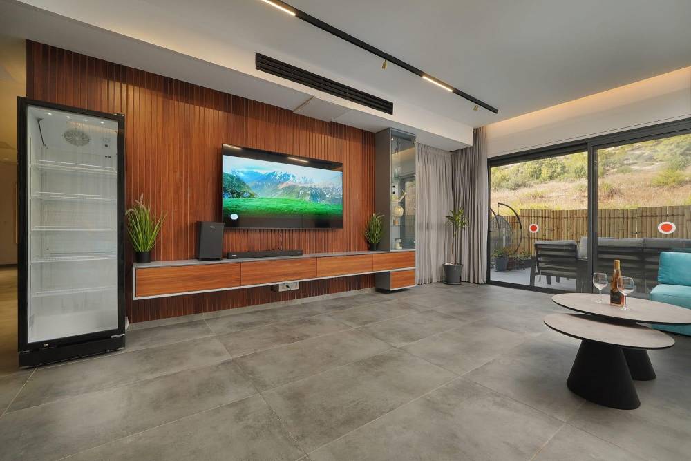 סלון עם מערכת ישיבה נוחה, מסך טלוויזיה מחובר לערוצי YES