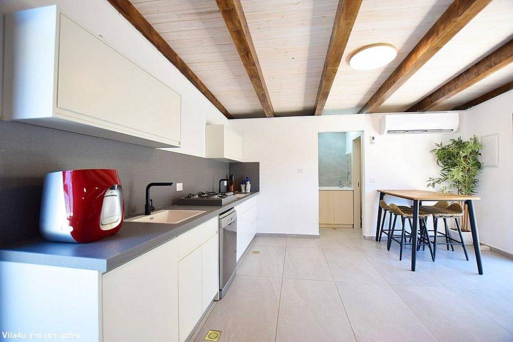 מטבח מאובזר: מקרר, מיקרוגל, מדיח כלים, מכונת קפה,  מתקן מים, כלי אוכל והגשה