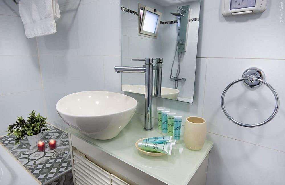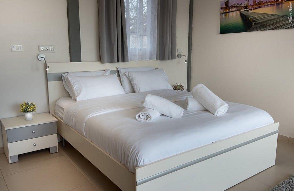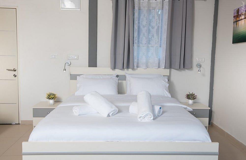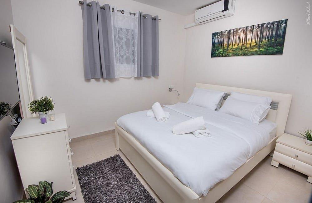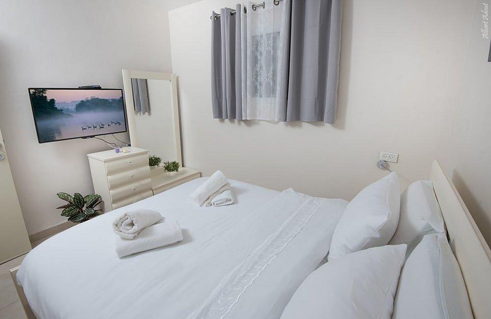 אבזור החדרים: מיטה זוגית, מיזוג אוויר, שידה וטלוויזיה