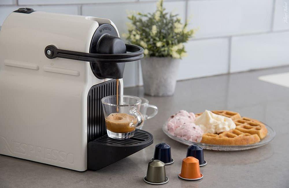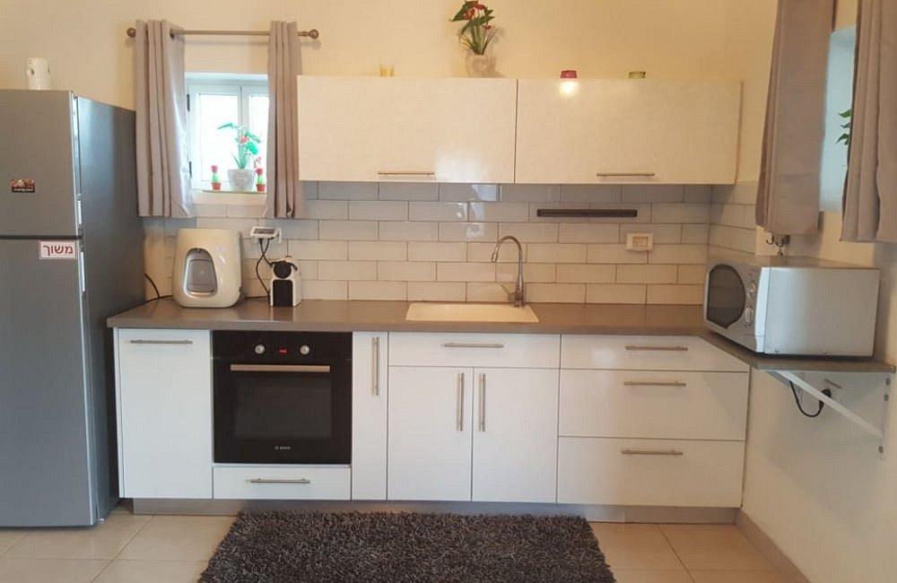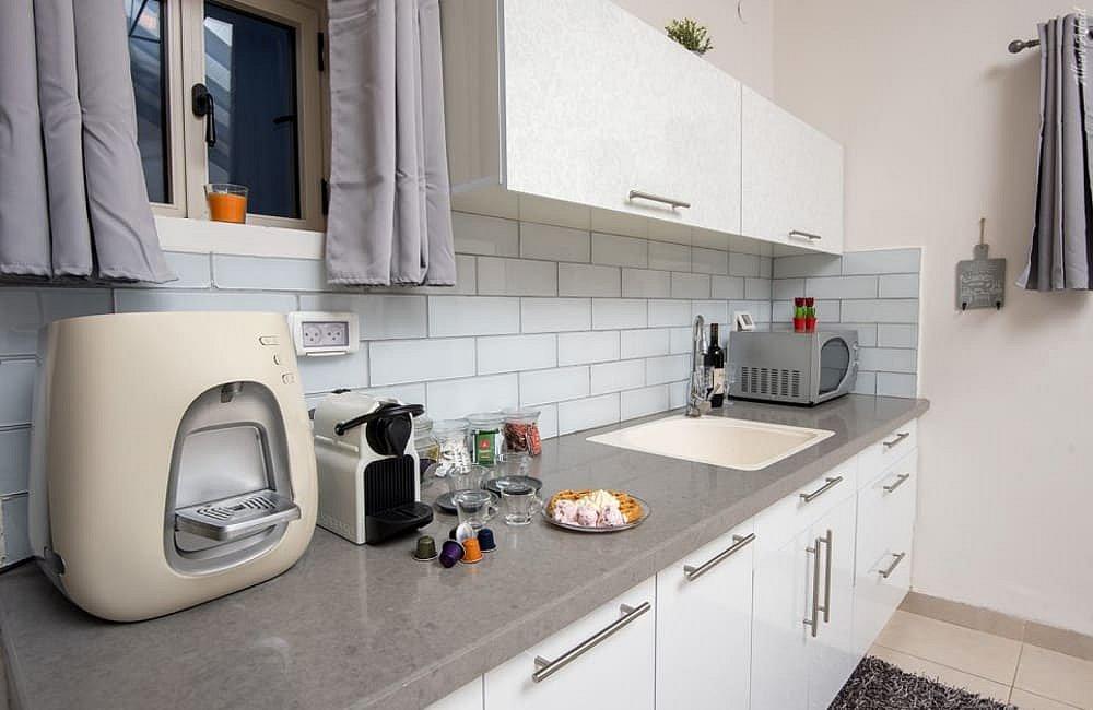 מטבח מאובזר הכולל: קומקום חשמלי, תנור אפייה, תמי 4, מכונת אספרסו, מקרר, כיריים חשמליות, מיקרוגל, כלי אוכל והגשה