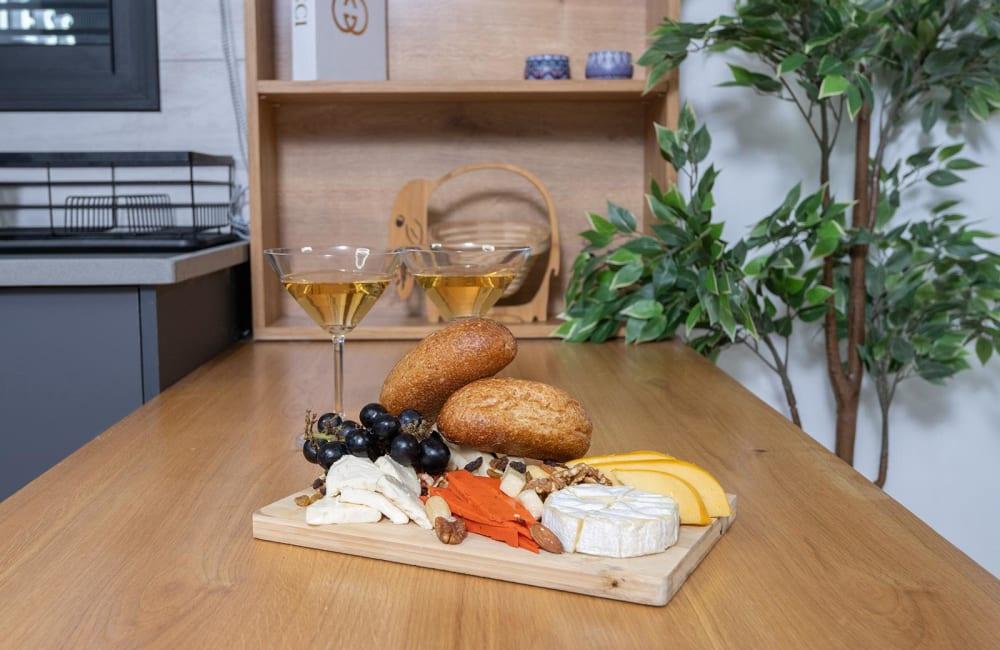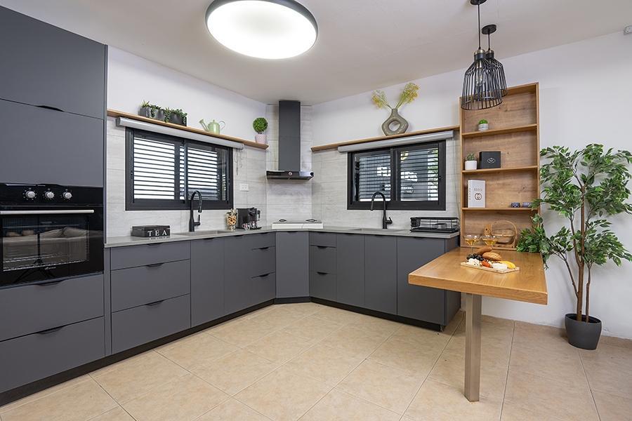 מטבח מאובזר ובו: תנור, מכונת קפה ומקציף חלב, מקרר, כיריים חשמליות, מיקרוגל, סירים ומחבתות