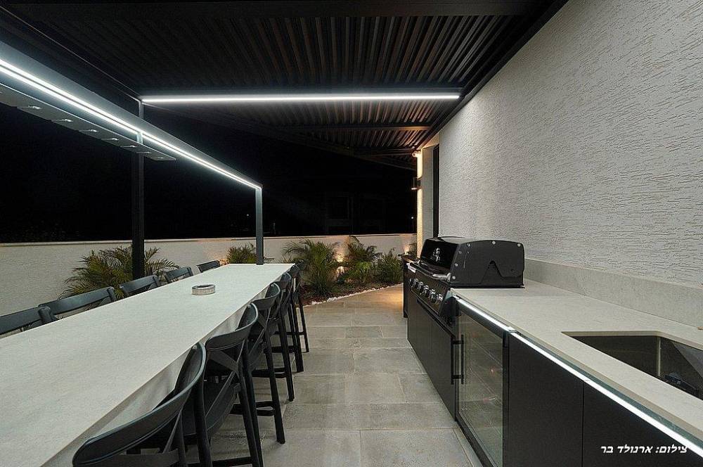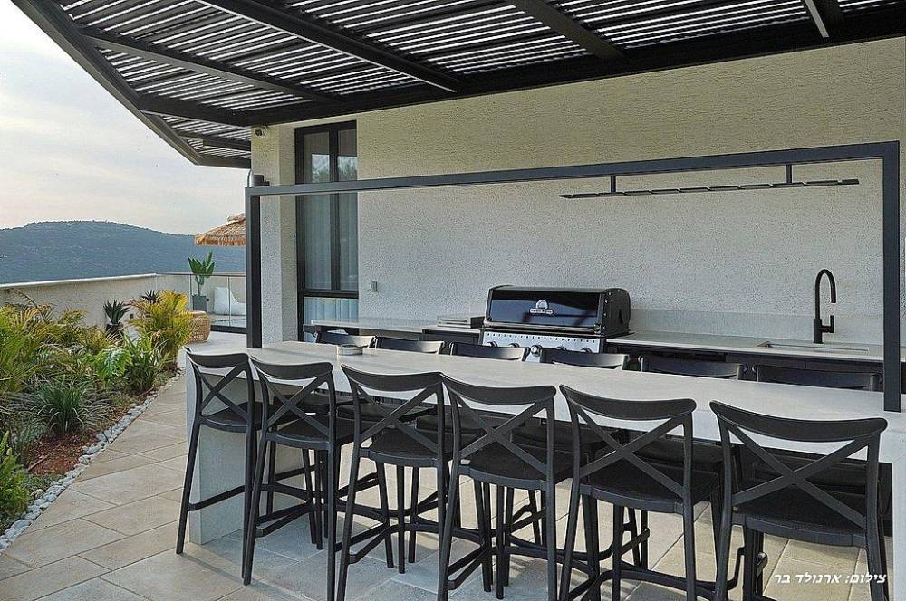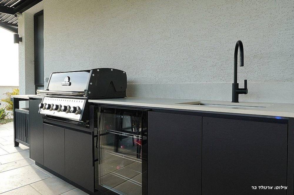מטבח חיצוני מאובזר הכולל: עמדת מנגל BBQ, מקרר, משטח עבודה ברז וכיור