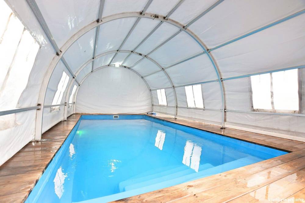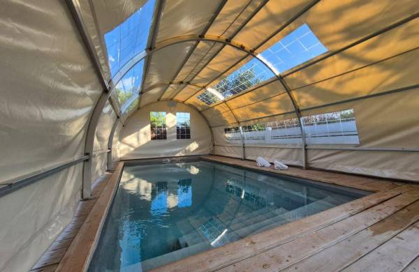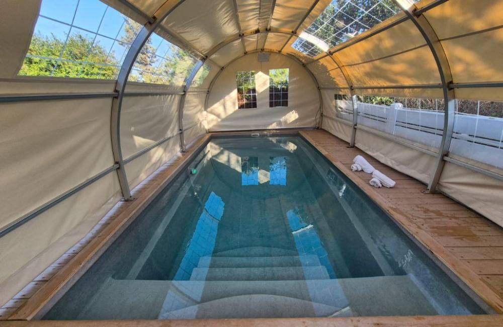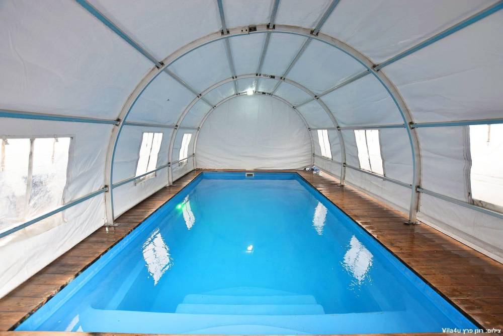 בריכת שחייה מחוממת ומקורה וחבילת משחקי קופסה משפחתית.