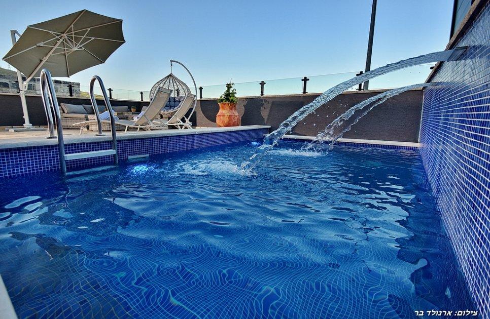 בריכת שחייה צלולה עם ספסל רביצה בגודל 5X3 הבריכה מגודרת ומחוממת בחורף