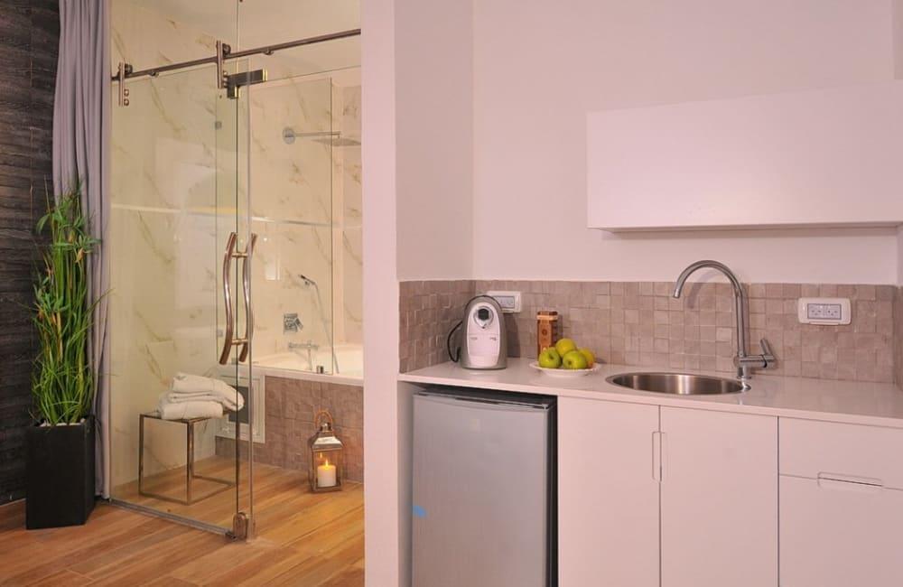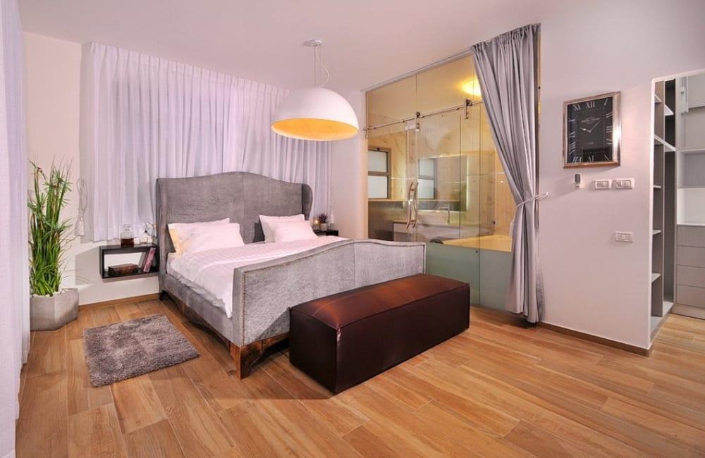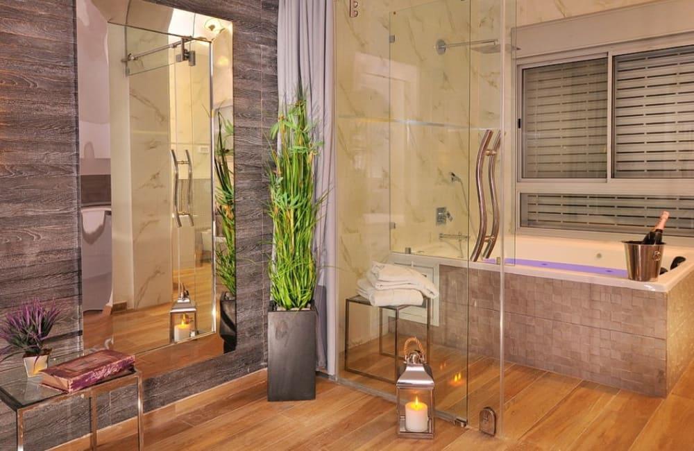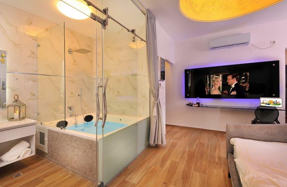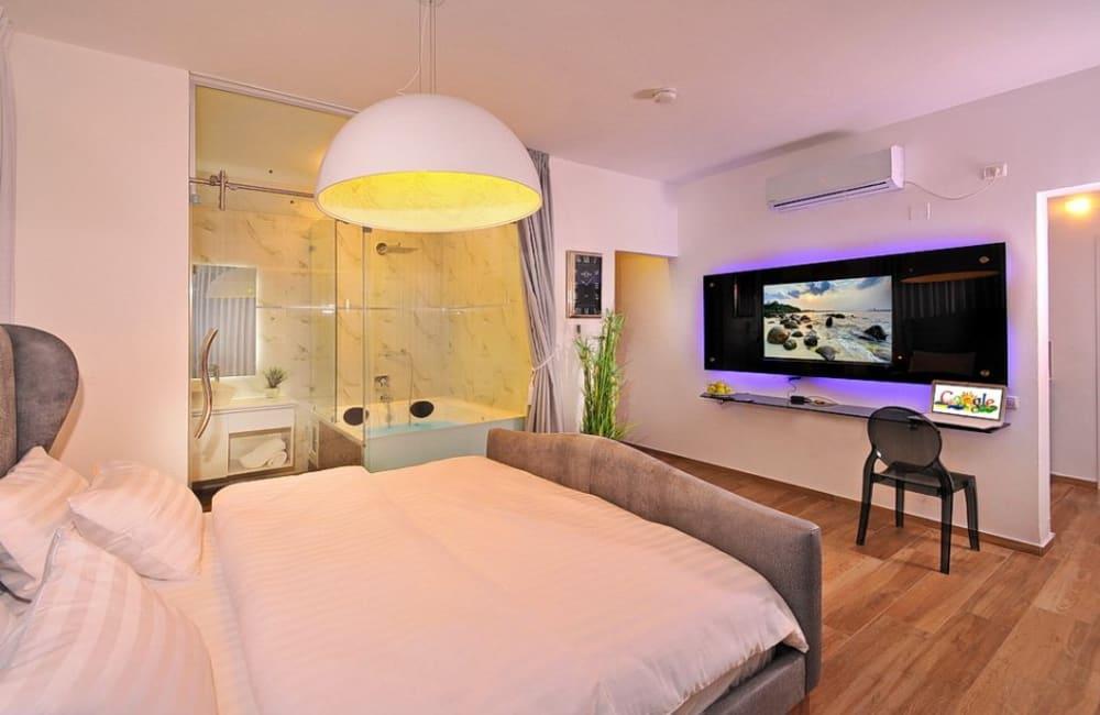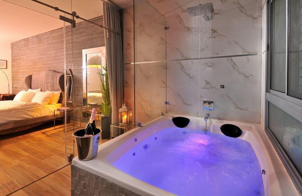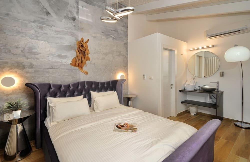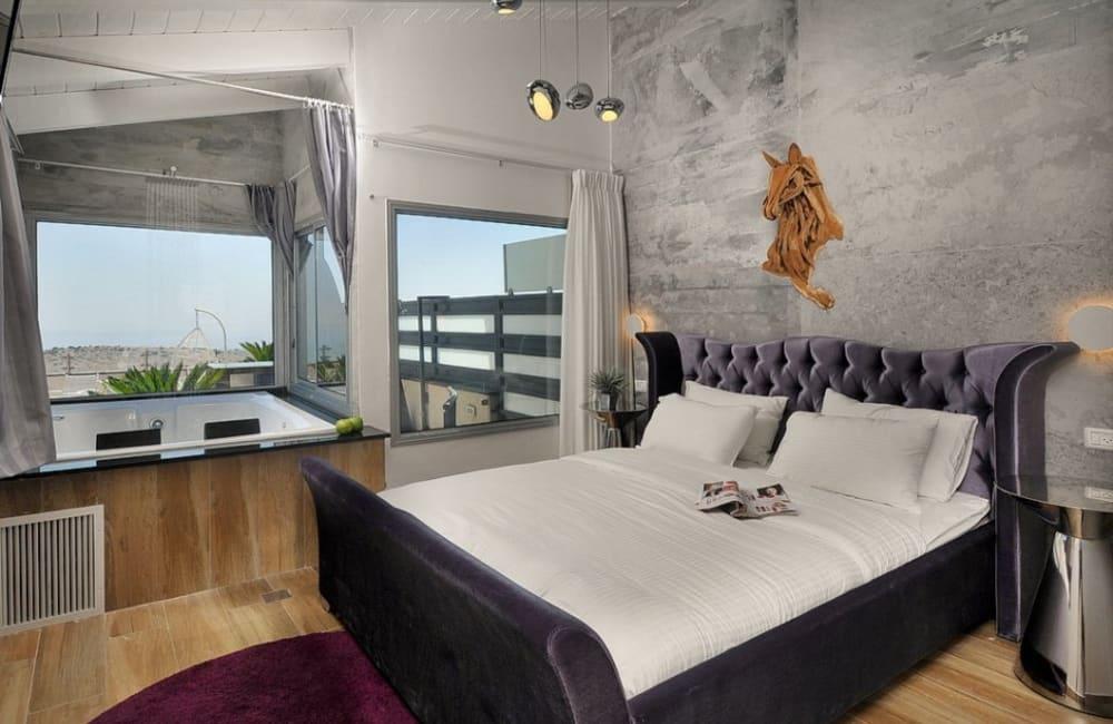 מיטה זוגית מוצעת, מיזוג אוויר, שידות, מסך צפייה, חדר רחצה פרטי (באחד מהם ג'קוזי פינתי)