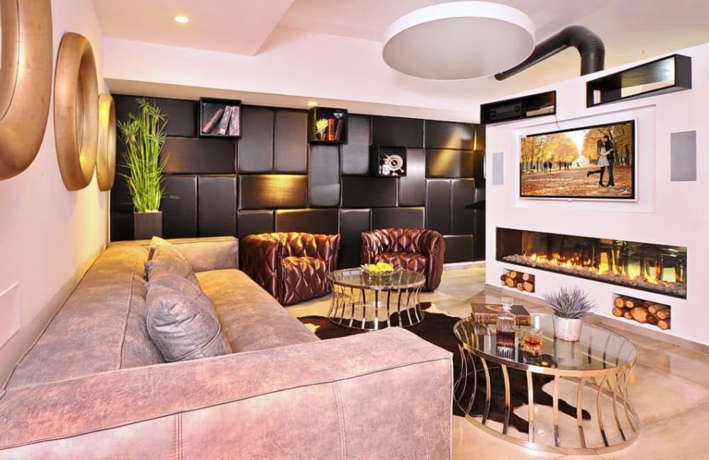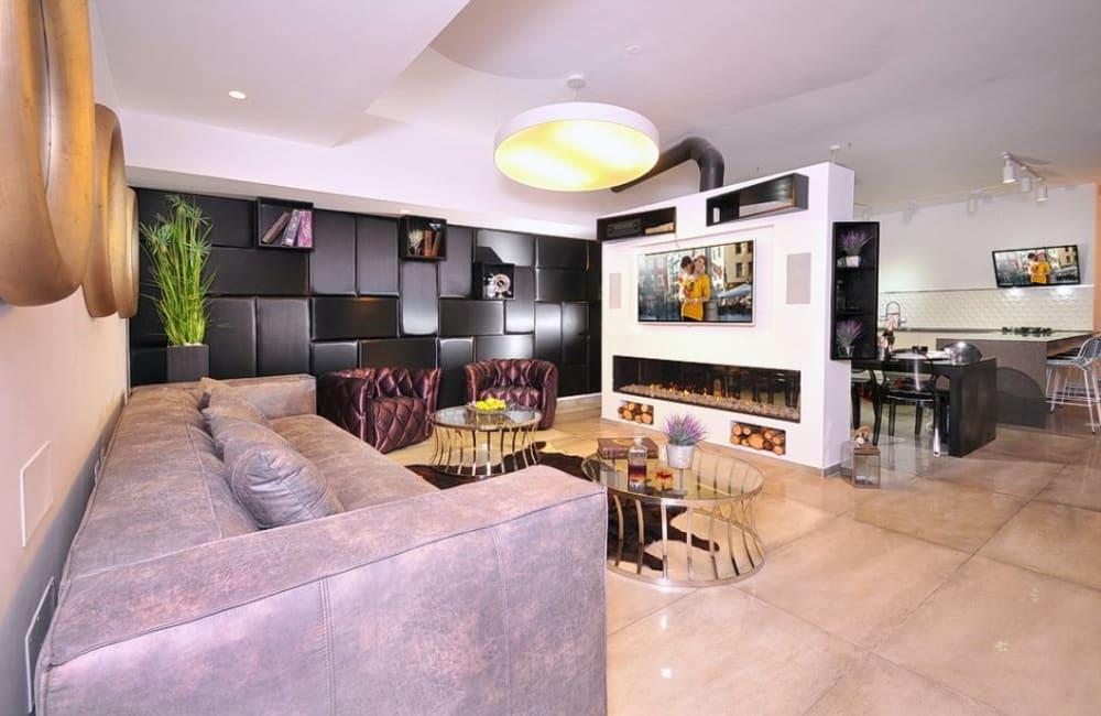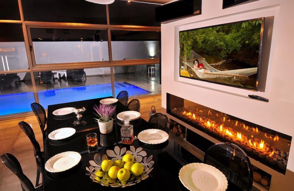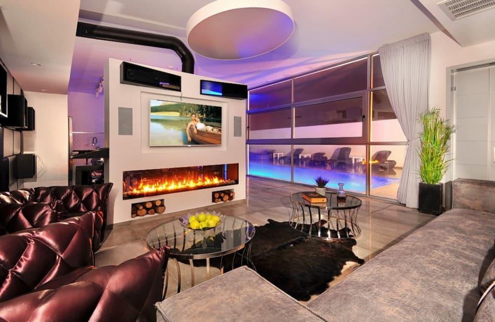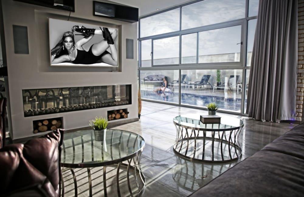 בסלון הפונה אל הבריכה מותקן מסך LCD בגודל 60 אינץ', על קיר מעוצב
