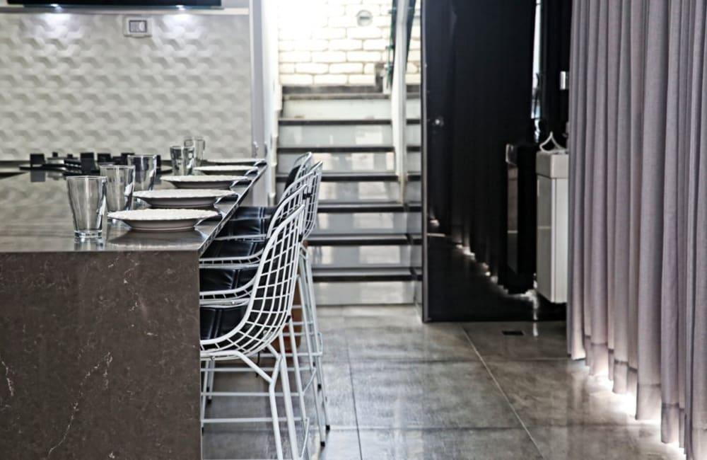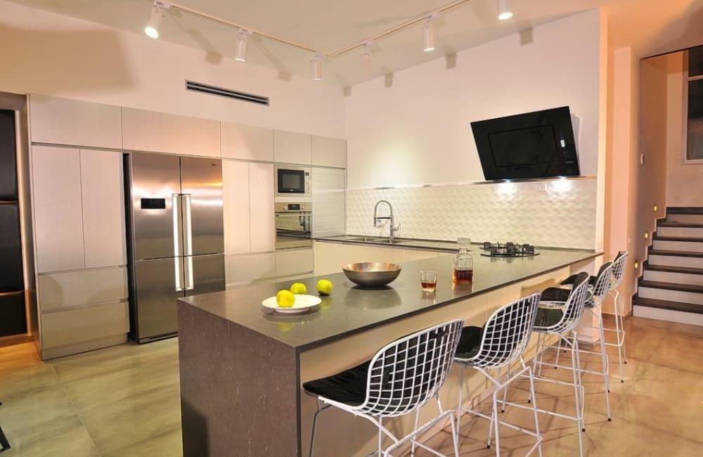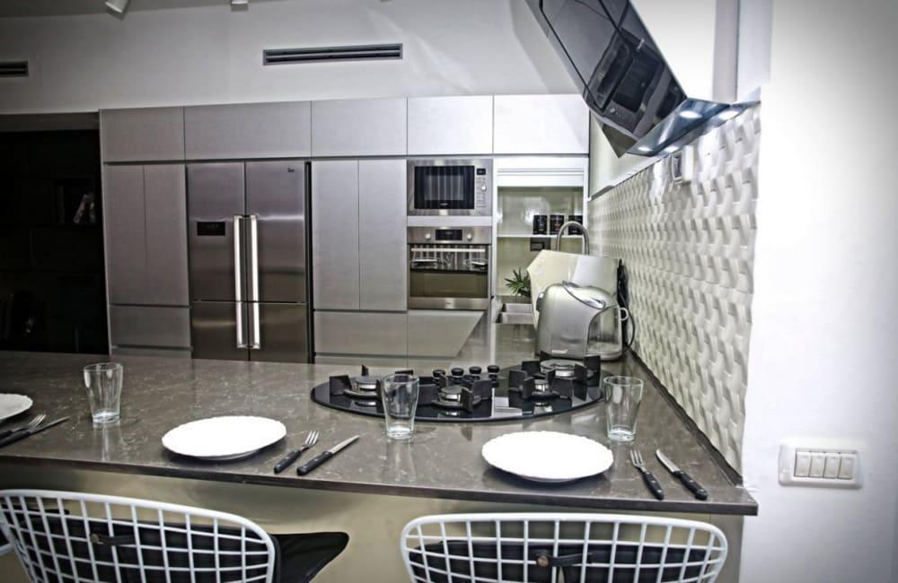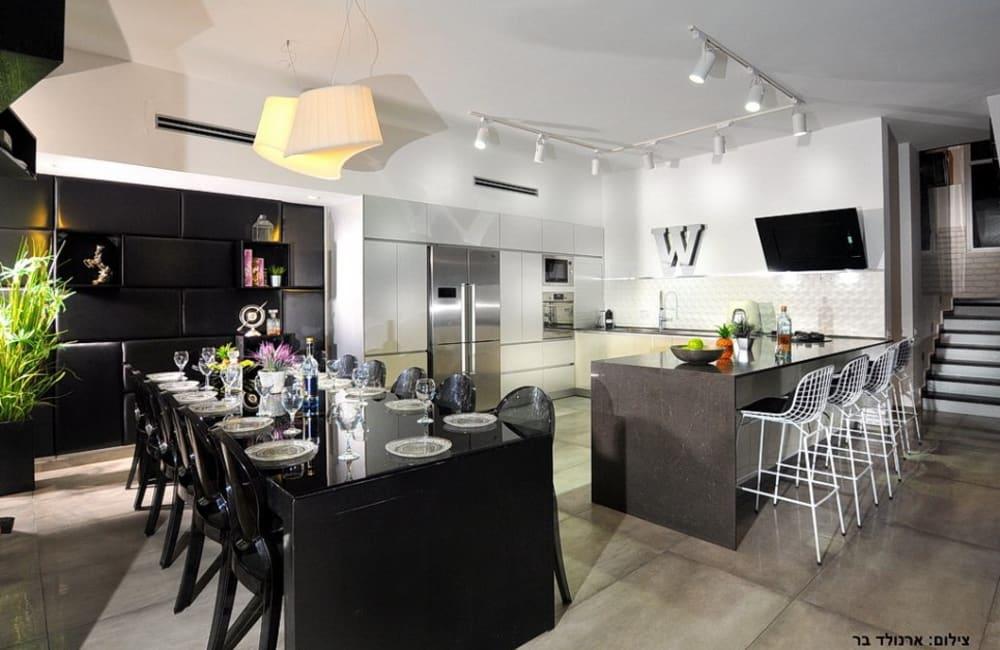 מטבח מעוצב ומרווח הכולל: מקרר, תמי 4, כיור מופרד, תנור אפייה, מיקרוגל, מכונת אספרסו, כלי אוכל והגשה