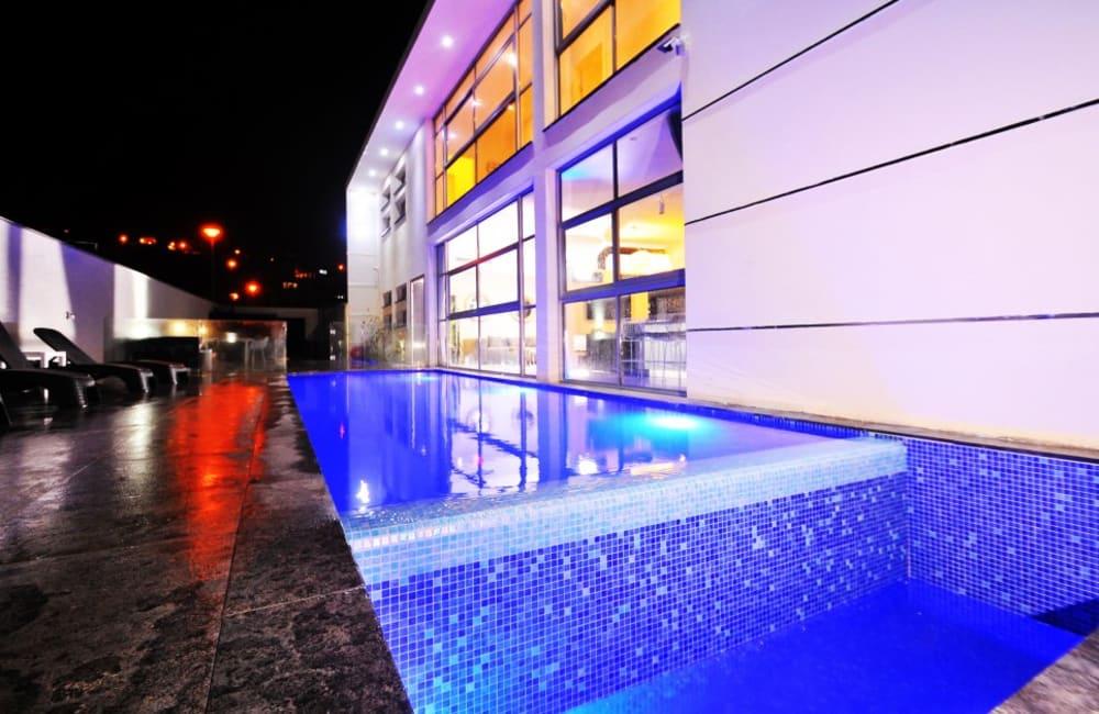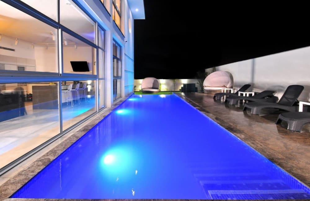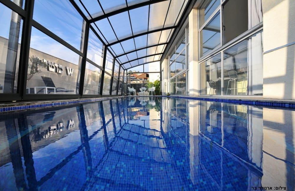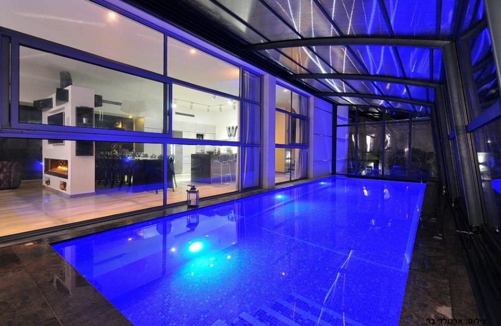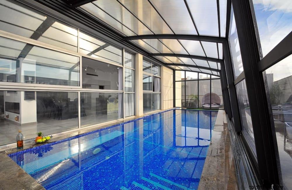 בריכת שחייה צלולה, גודל 10X3.5 בטיחותית. הבריכה מחוממת ומקורה בחורף