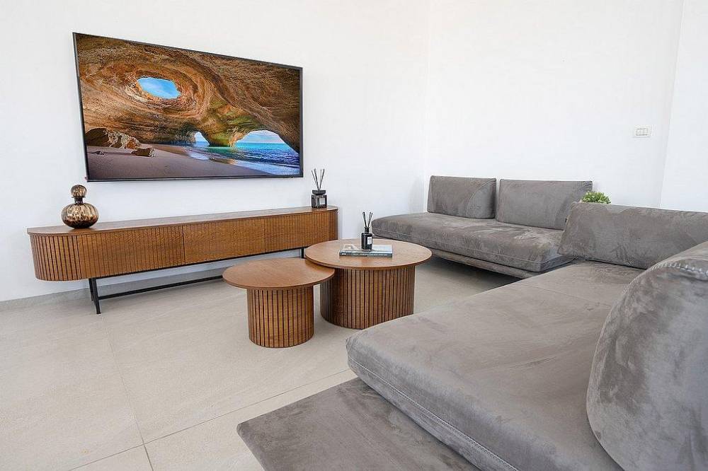סלון עם טלוויזיה חכמה 75 אינץ', מטבח מאובזר, 2 חדרי שינה, 2 חדרי רחצה, שירותי אורחים.