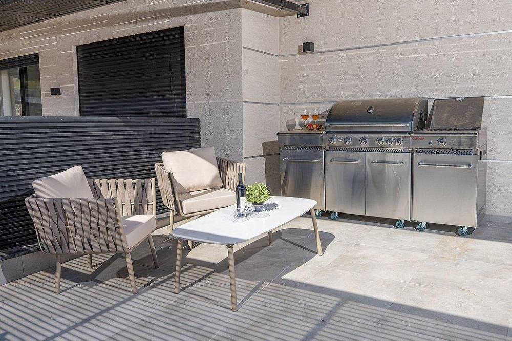 החצר כוללת פינות ישיבה איכותיות, עמדת BBQ מרשימה ותאורת ערב רומנטית.