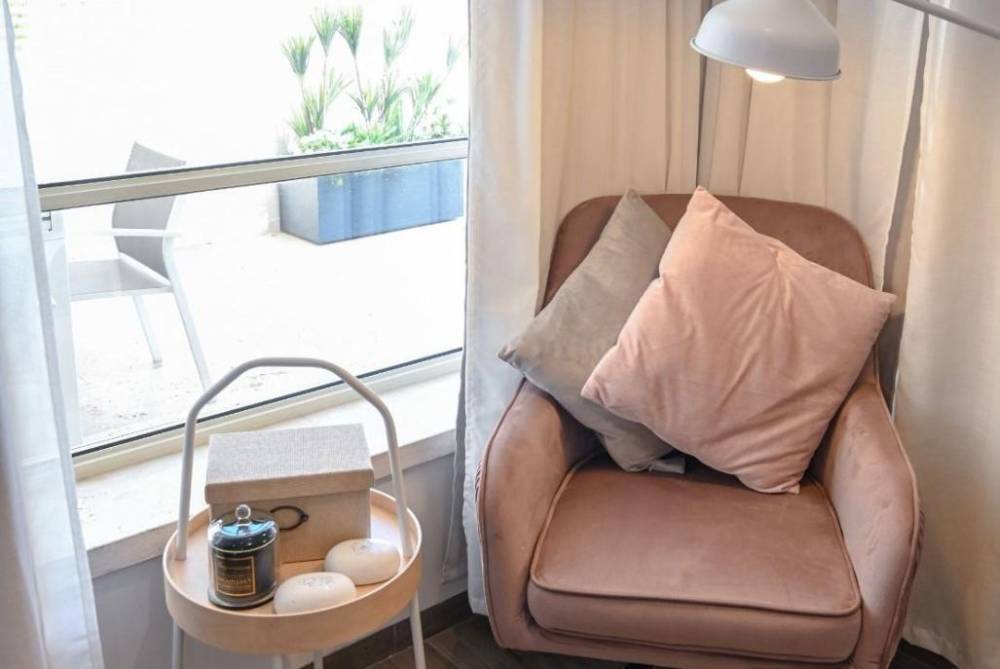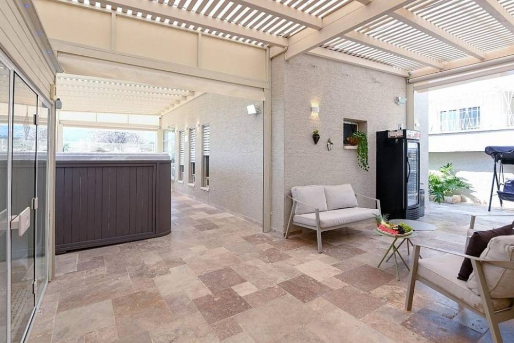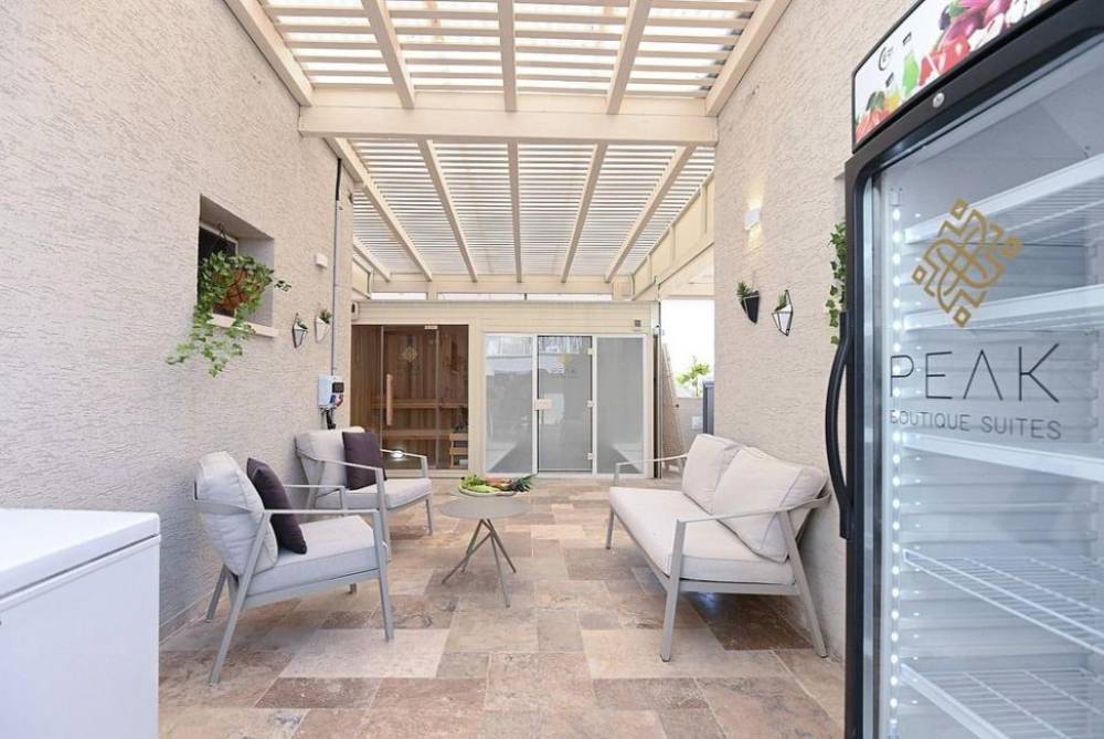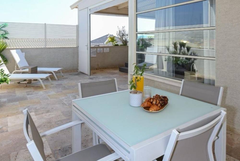 בחצר הסוויטיה נמצא פינות ישיבה מפנקות, מיטות שיזוף, עמדת מנגל ויציאה לבריכה המשותפת.