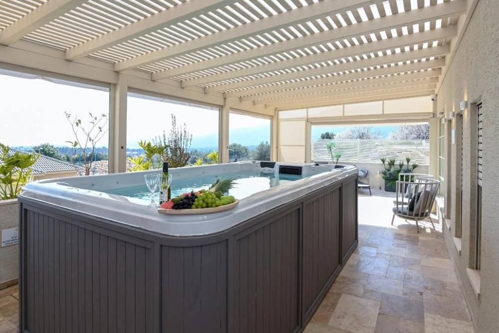 בריכה גדולה ומחוממת עם משטח רביצה, סאונה יבשה ורטובה, מקלחת חיצונית, מיטות שיזוף, פינת ישיבה ומקרר גדול.
