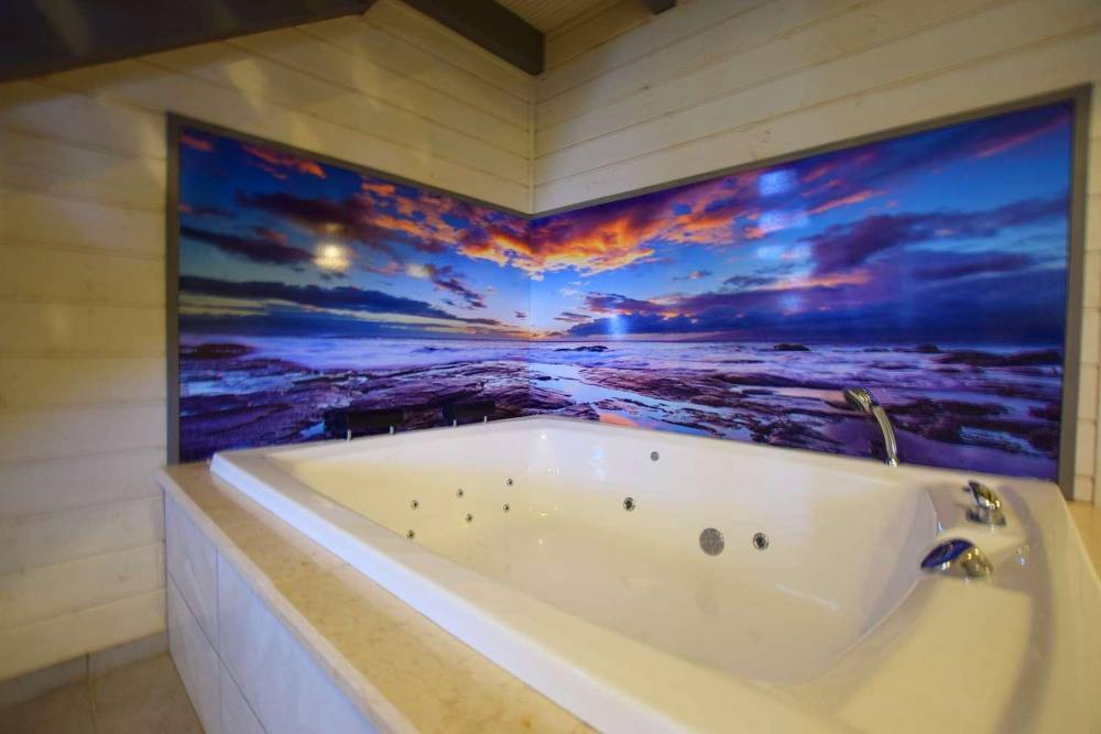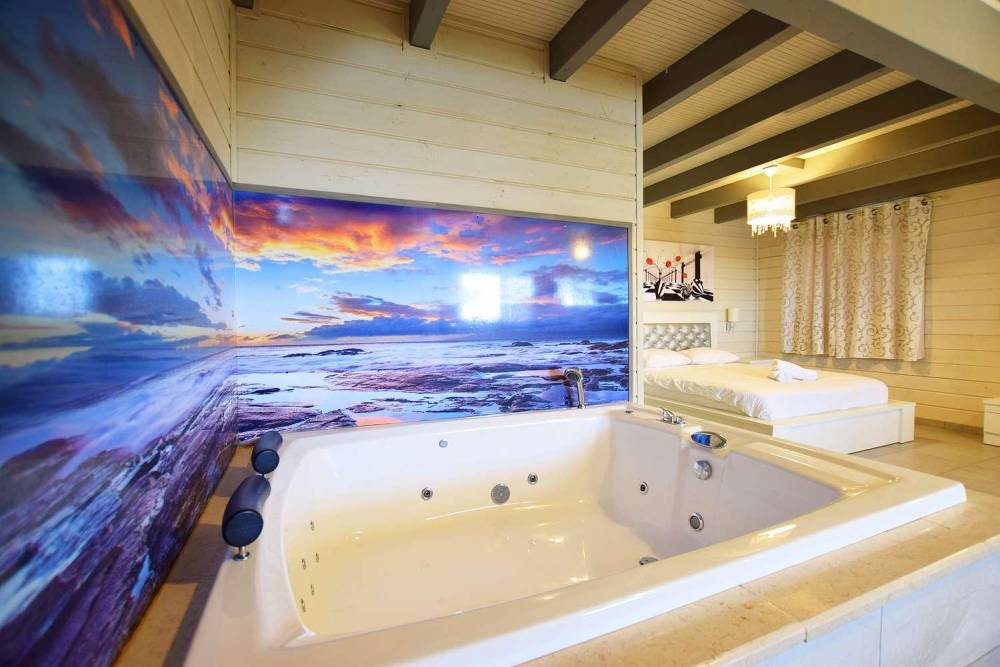 חדר רחצה עם אמבט ג'קוזי, מגבות רחצה וסבונים