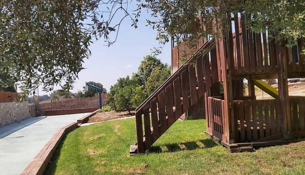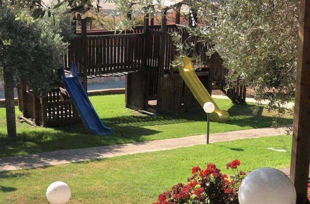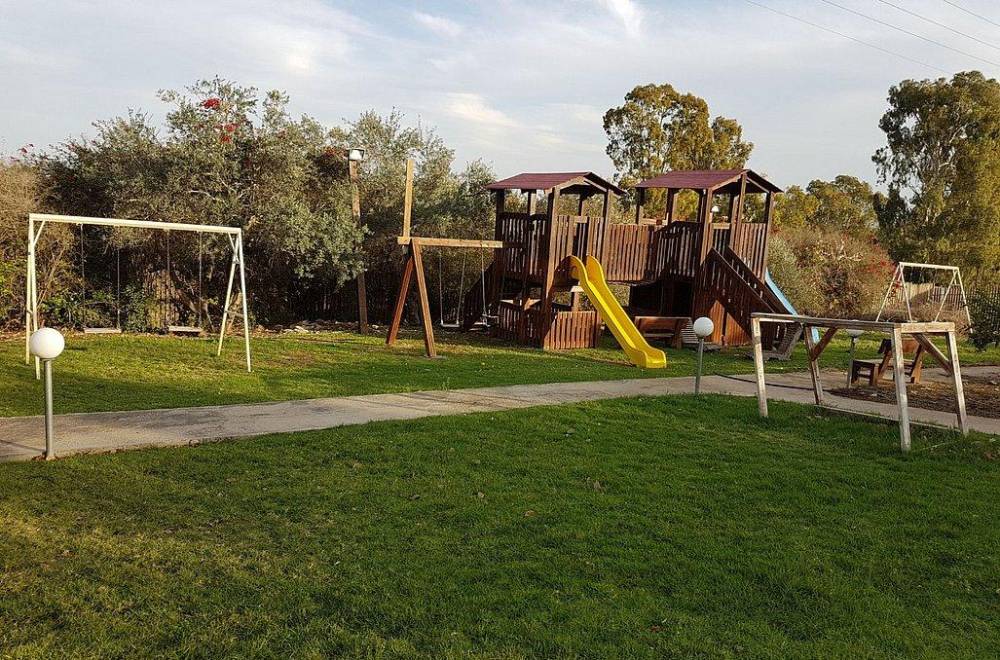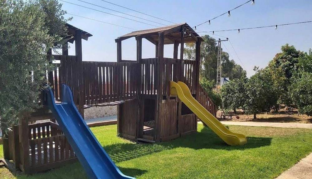 גן שעשועים גדול הכולל מגלשות, נדנדות ושאר אטרקציות לילדים