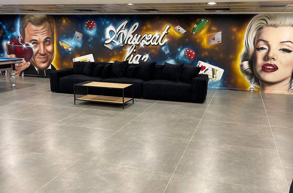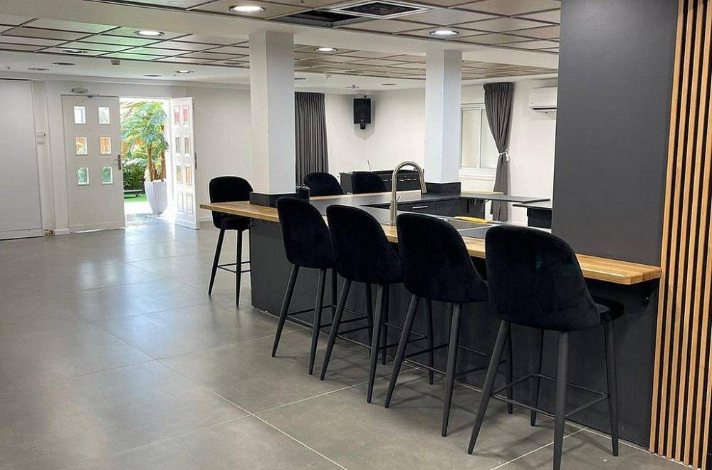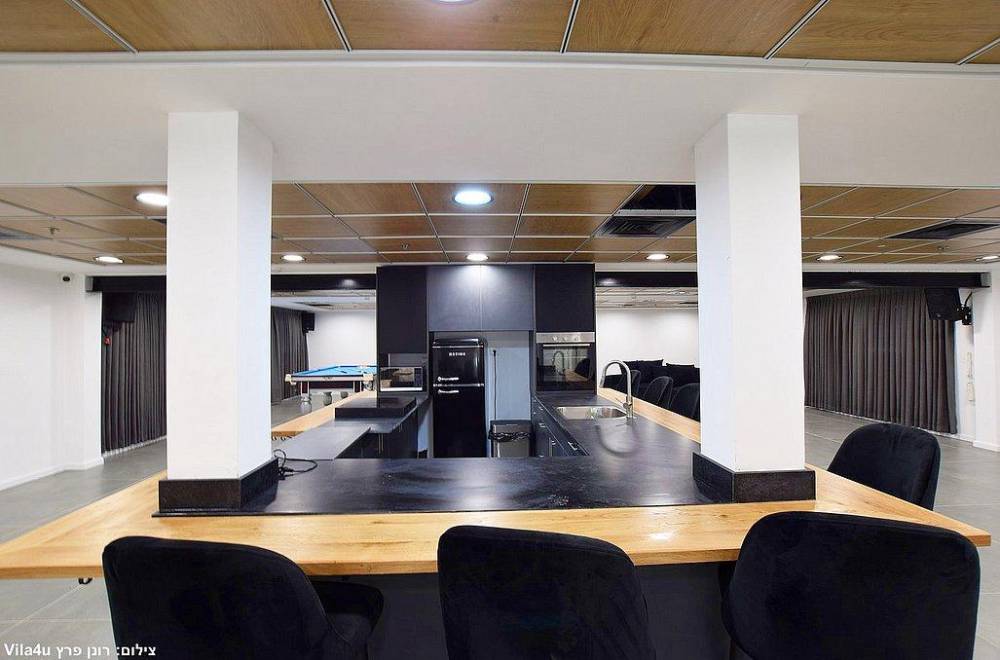 בלב המתחם ממקום מטבח בר יוקרתי עם כיסאות גבוהים