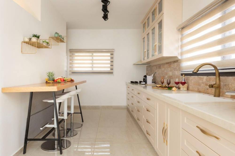 מטבח מעוצב הכולל: מקרר, מיקרוגל תנור, טוסטר, כיריים גז, כלי אוכל והגשה, תמי, מכונת אספרסו