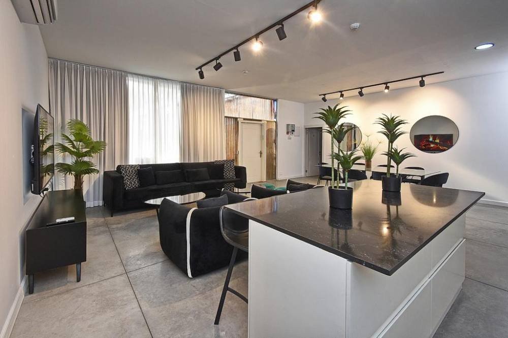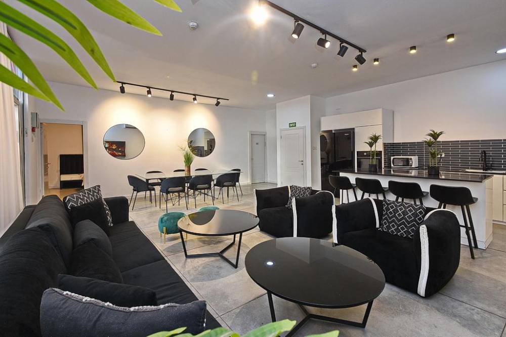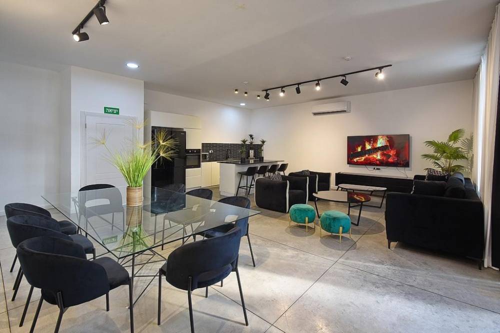סלון מפואר עם מערכת ישיבה וטלוויזיה
