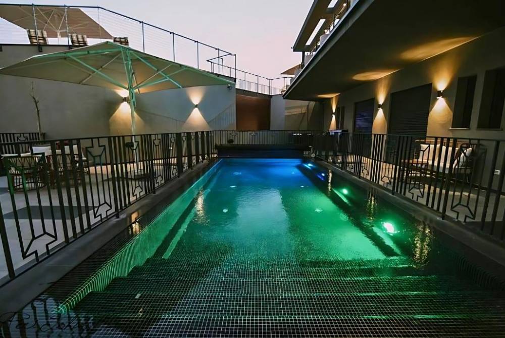 בריכת שחייה (מחוממת מקורה) מגודרת (גודל: 12×4 מטר, עומק מקסימלי: 1.5 מטר).