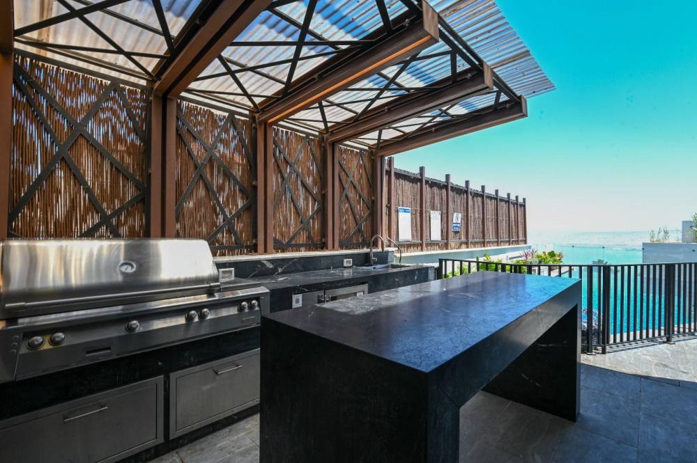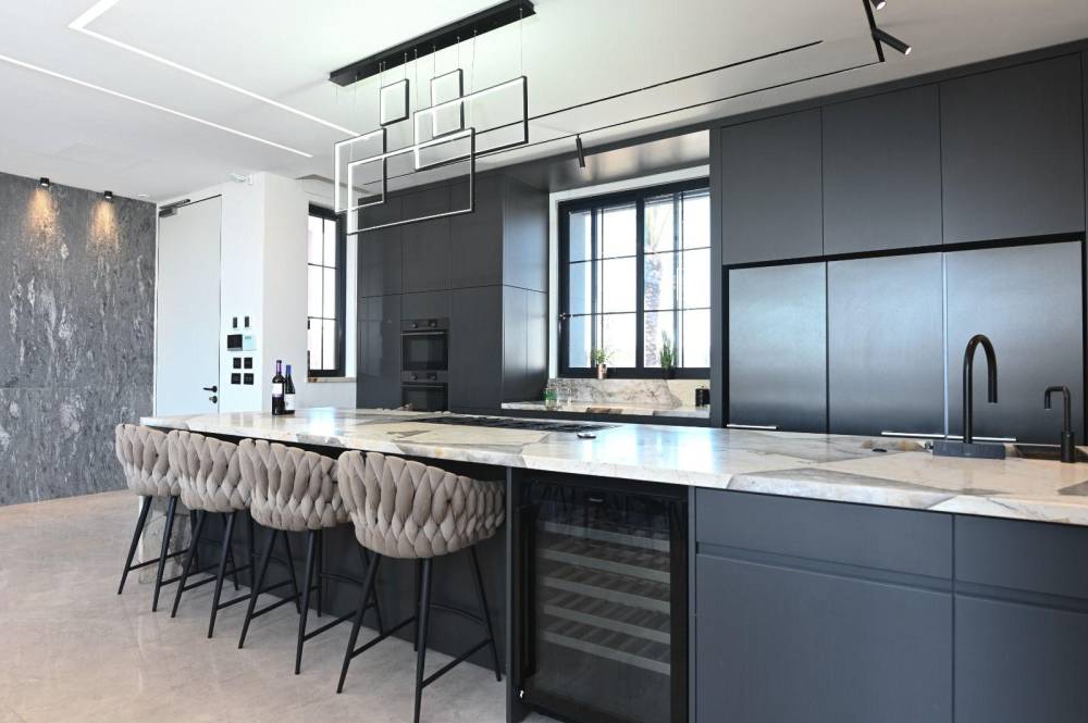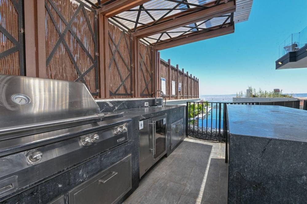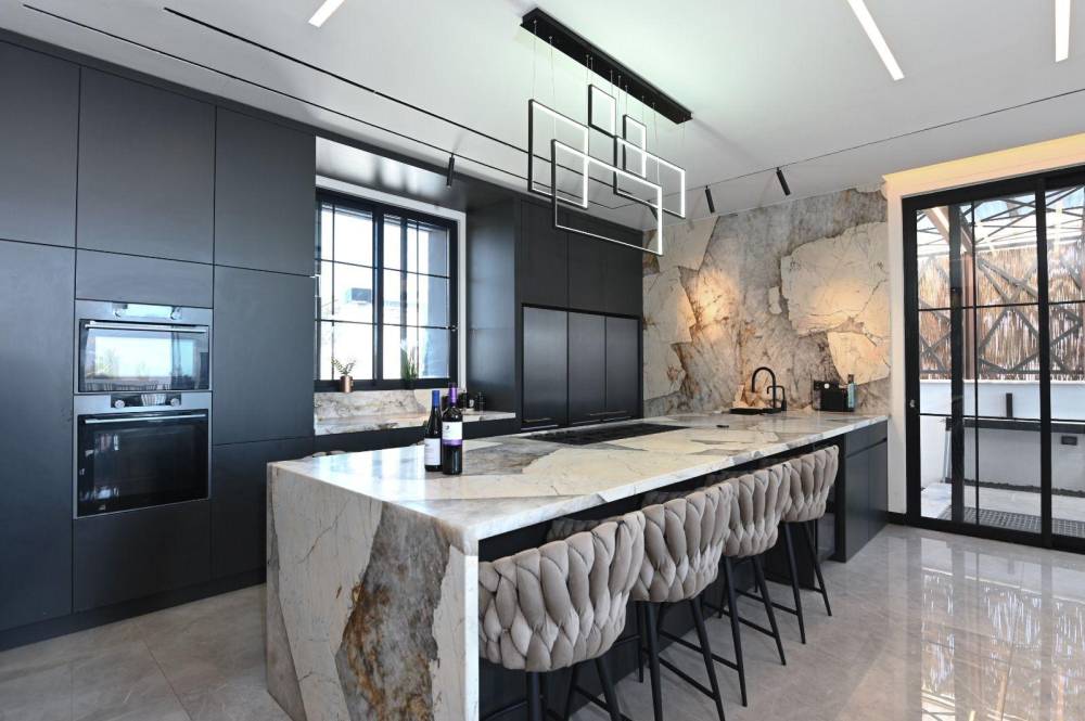 מטבח מאובזר - אי עם 4 כסאות, 2 מקררים, מקרר יינות, כיריים, מיקרוגל, תמי4, מכונת קפה, מכונת קרח, טוסטר, כלי אוכל והגשה.